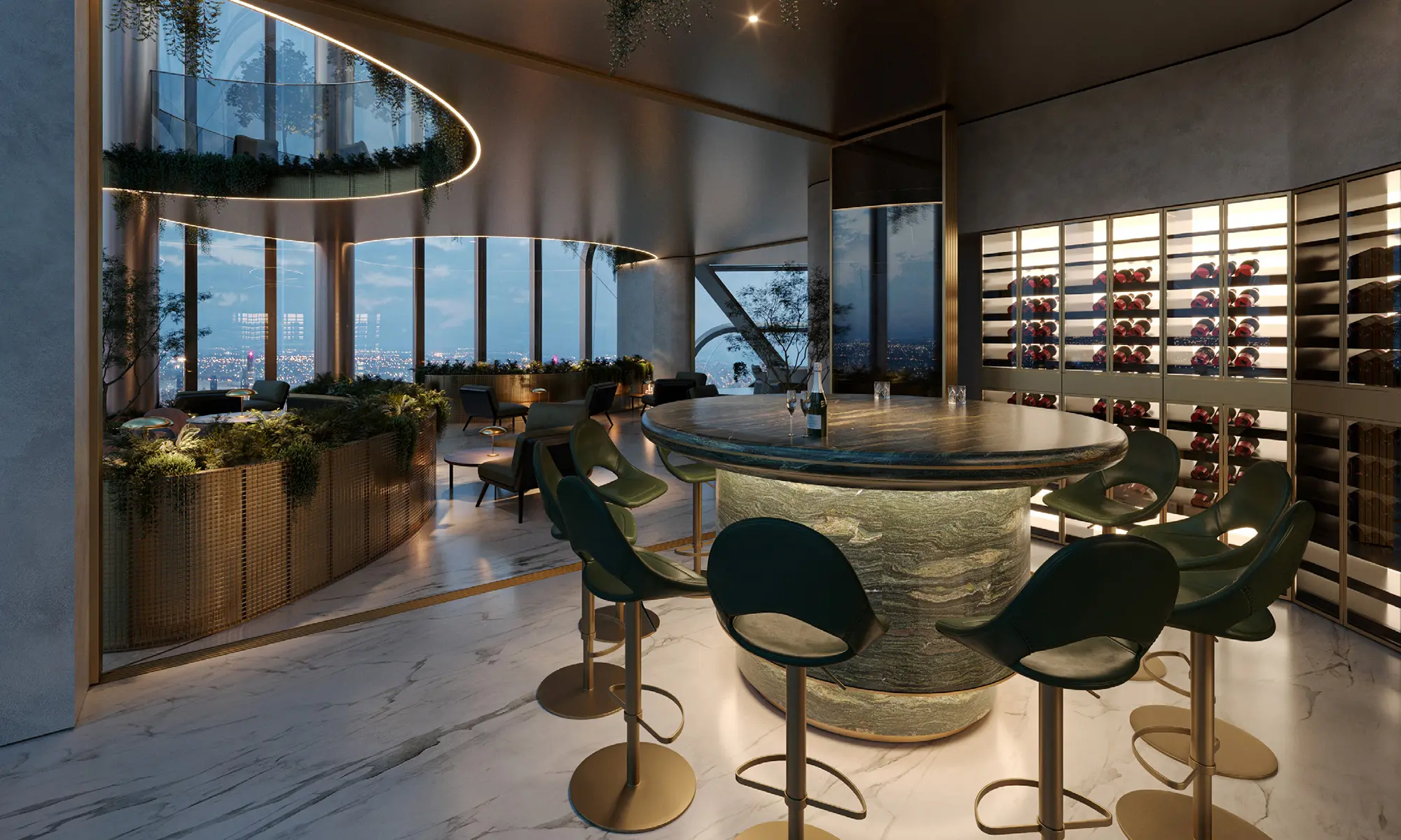 Three amenity zones — Sky Club, Horizon Collective & Wellness Club — offer everything from private dining, a whiskey lounge, coworking suites, cinema and music rooms to spa, sauna, pool and outdoor gardens.