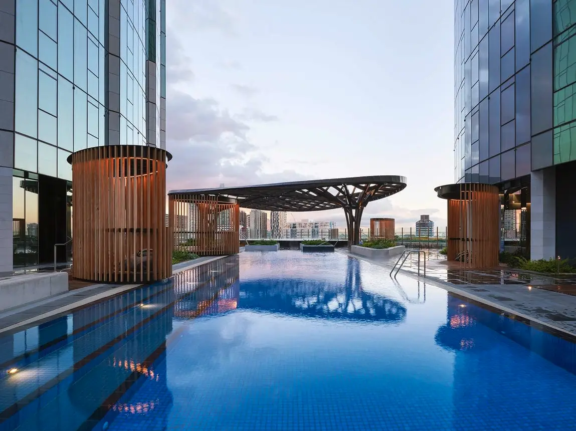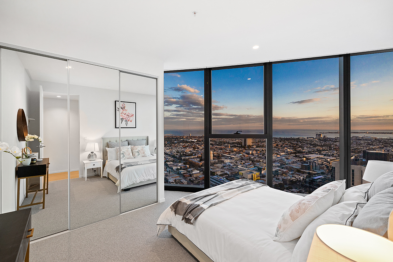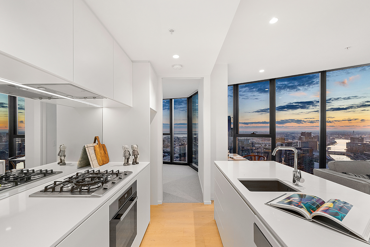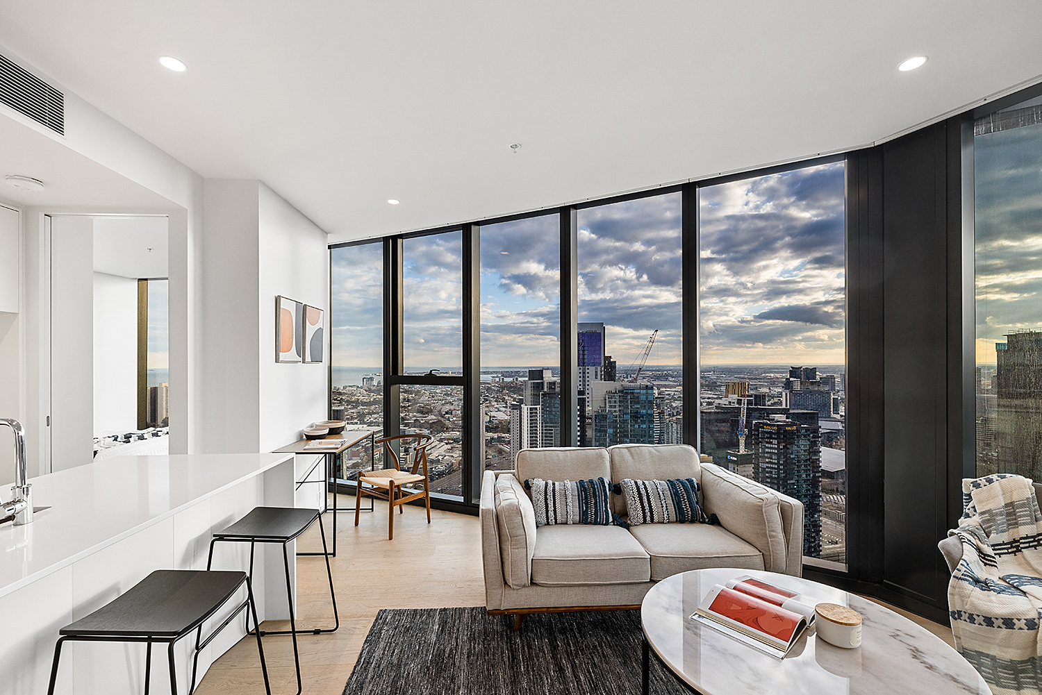 Amenities include a sweeping resort-style heated outdoor lap and wading pool, a sun terrace, an indoor pool with views over Melbourne, sauna, yoga studio, music room, gyms, golf simulator, cinema, private dining areas and kitchen facilities.