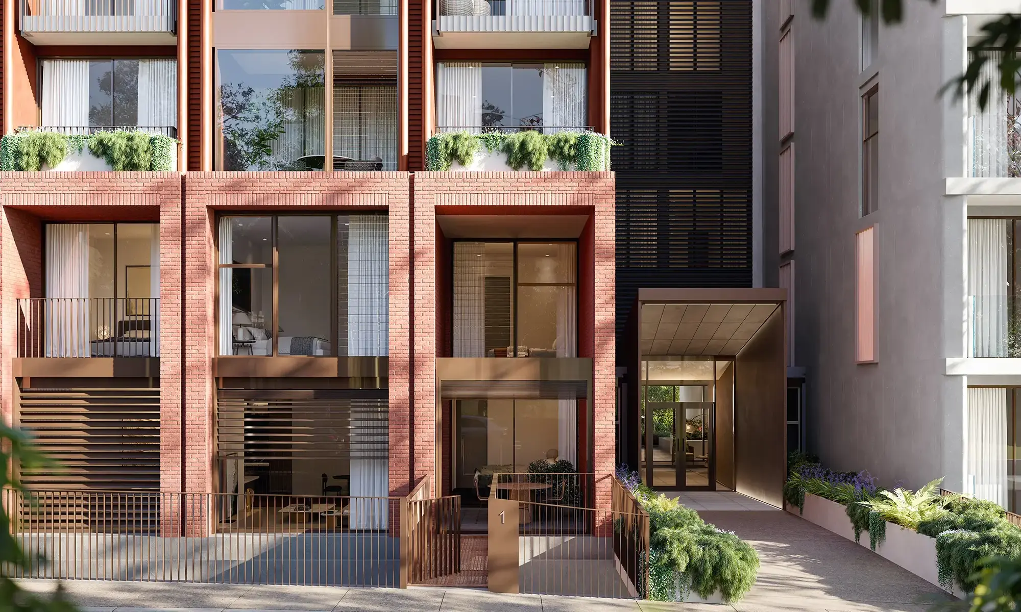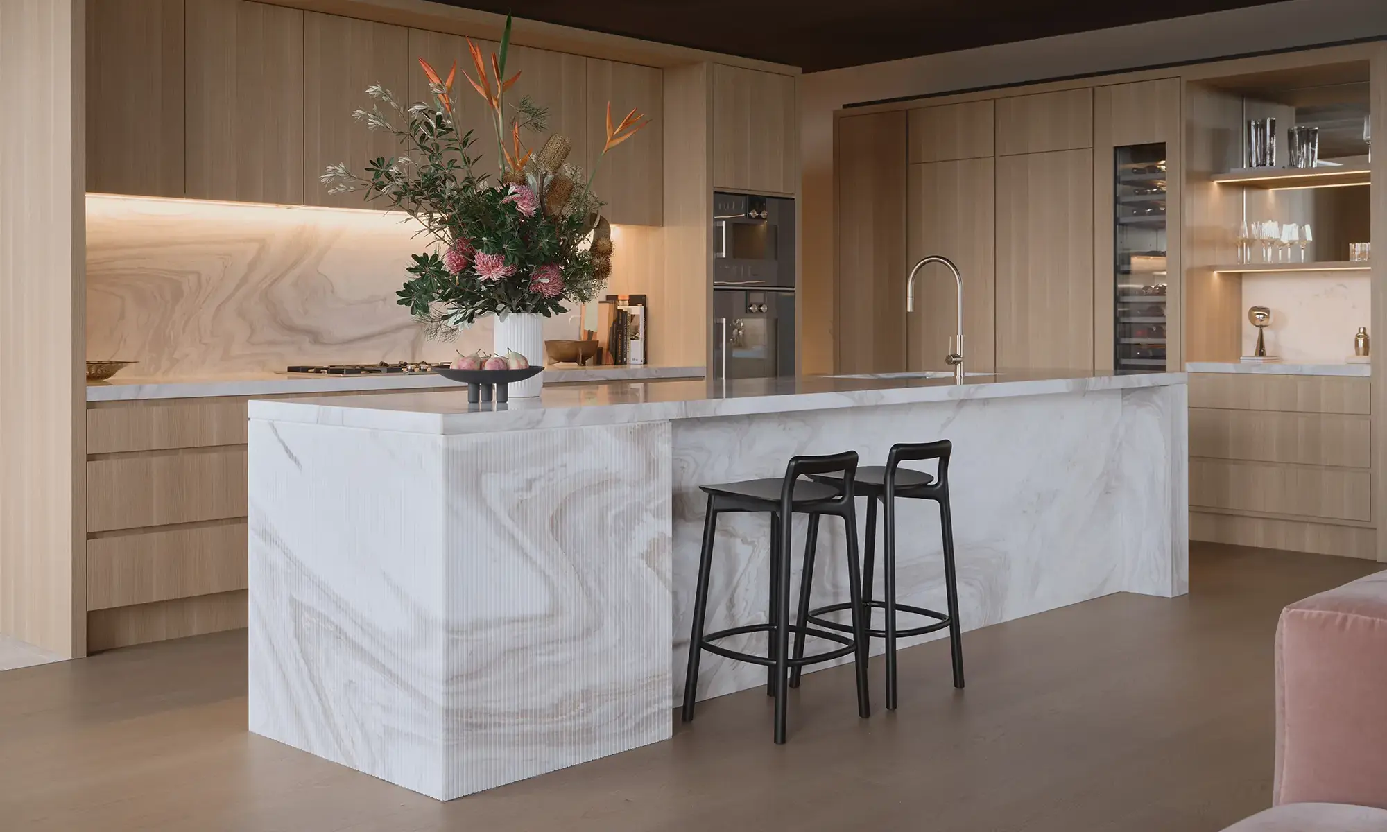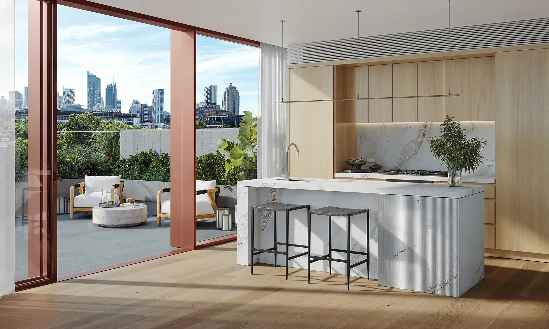 Residences feature Gaggenau appliances, marble island benches, generous 2.7m ceilings, performance glazing and thoughtfully detailed layouts.