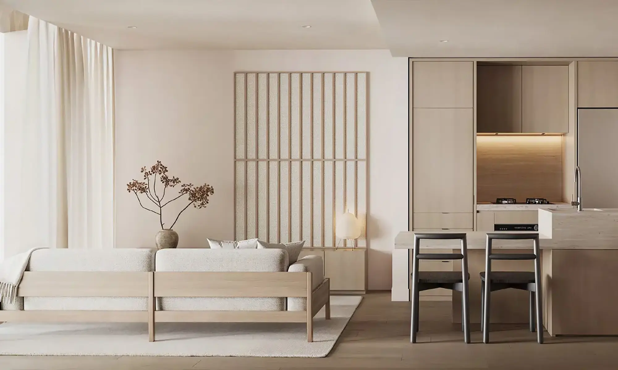 Natural palettes, refined textures, engineered timber floors and understated detail create a luxurious atmosphere of calm simplicity.