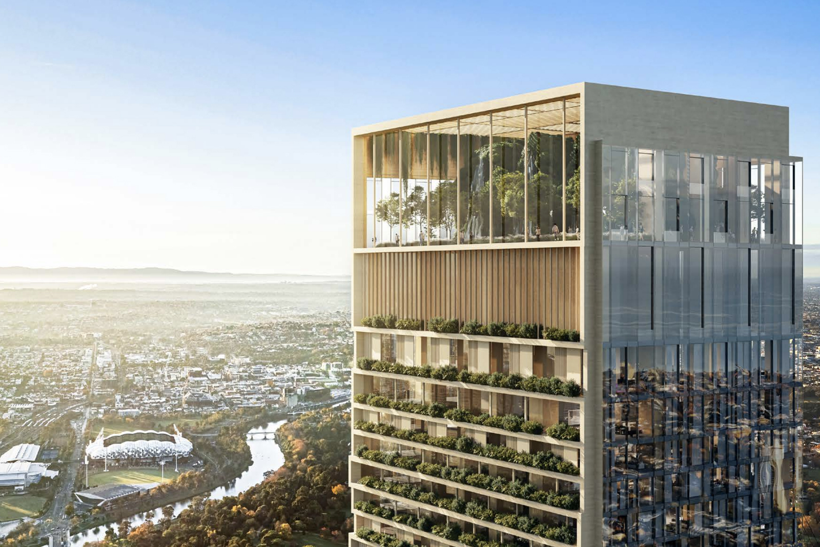 Set to be Australia’s tallest building, STH BNK By Beulah will be a stunning sculptural form composed of two towers defined by twisting geometric glass façades and the highest vertical garden in the world. A world-class multi-use development that sets a benchmark in liveable urban design, it is a city within a city. An ecosystem that is culturally enriching, imbued with a sense of community and belonging. A place where everything is connected and curated. A place to shop, stay, work, visit and learn. A place to get back to nature, among Melbourne’s highest gardens. And, at the end of the day, a place to return home.