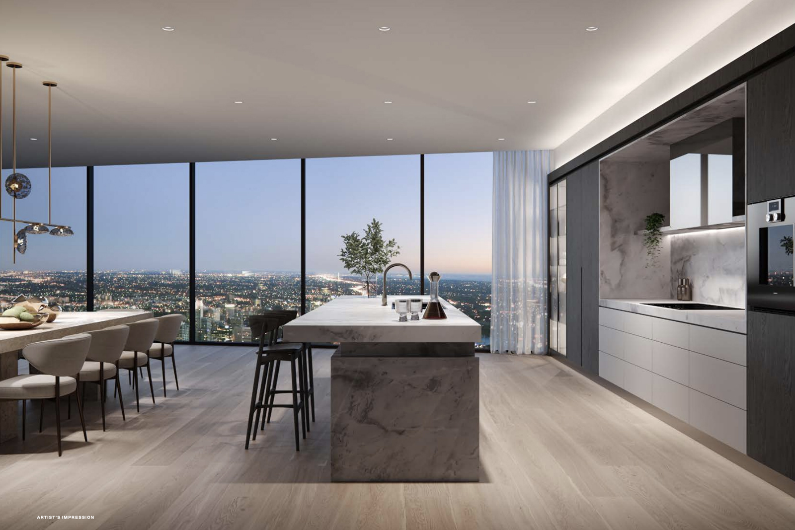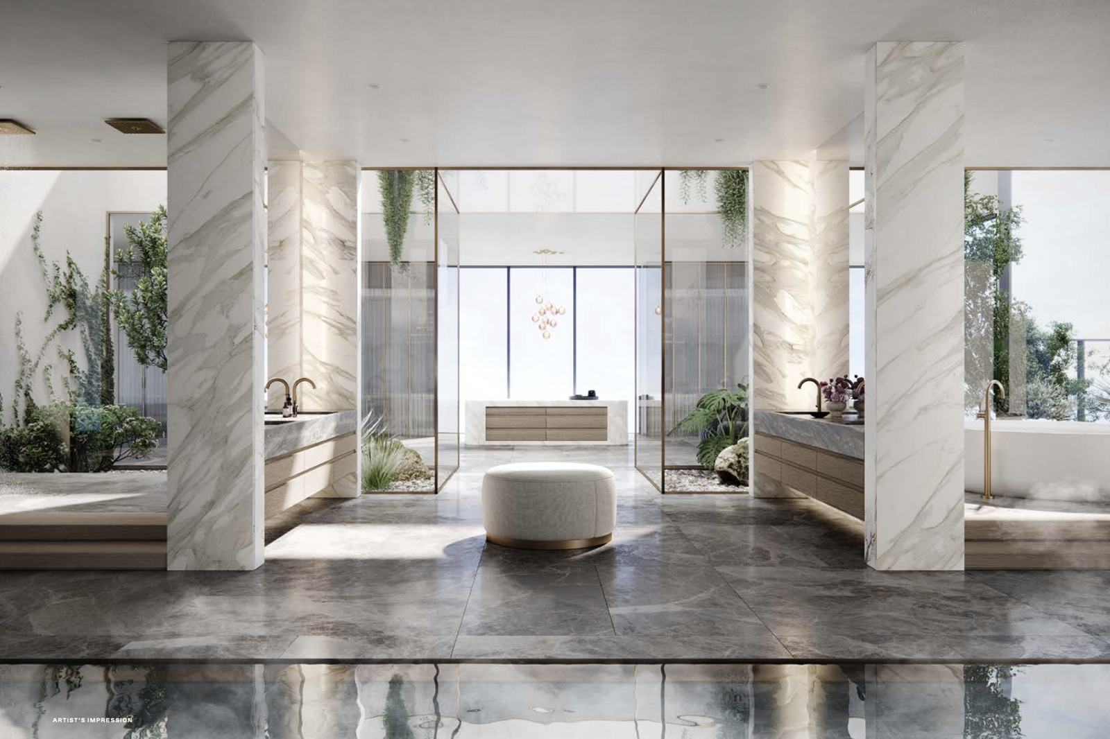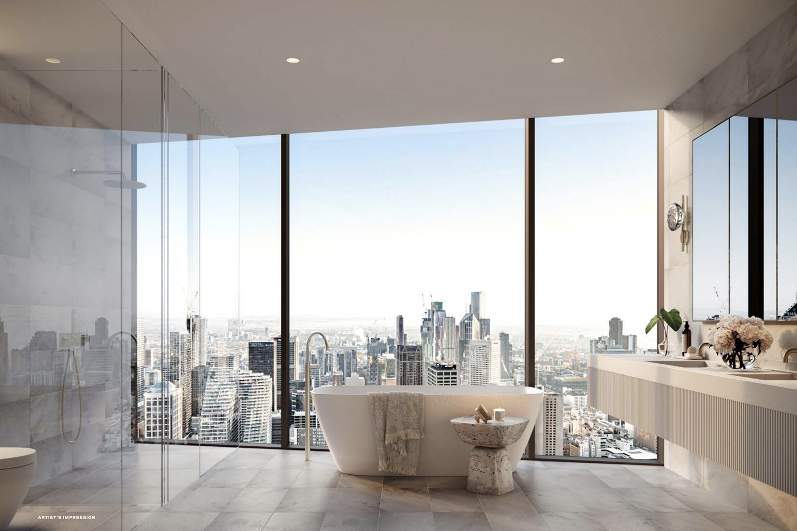 Entertainment areas are directed towards breathtaking taking views; bedrooms provide a retreat with walk-in robes and ensuites; dedicated study rooms draw on natural light and air. In each space, the materials are timeless, calming and neutral, reflecting the greenery of the gardens outside the window and the warmth that every modern home should have. The interiors of the residences are inspired by the building’s gardens and the views of surrounding Melbourne. The building’s iconic greenery acts as a natural control of daylight, shielding the apartments from direct sun during summer while maximising the natural light in winter. From the intuitive design of the kitchen spaces to the resilient surfaces of natural stone, large format porcelain tiles and metal accents, these living spaces have been designed for practical daily use and timeless appeal. Bathrooms and other rooms look out over lush greenery framing the spectacular city views, while earthy tones and natural materials create an environment of restrained organic beauty.