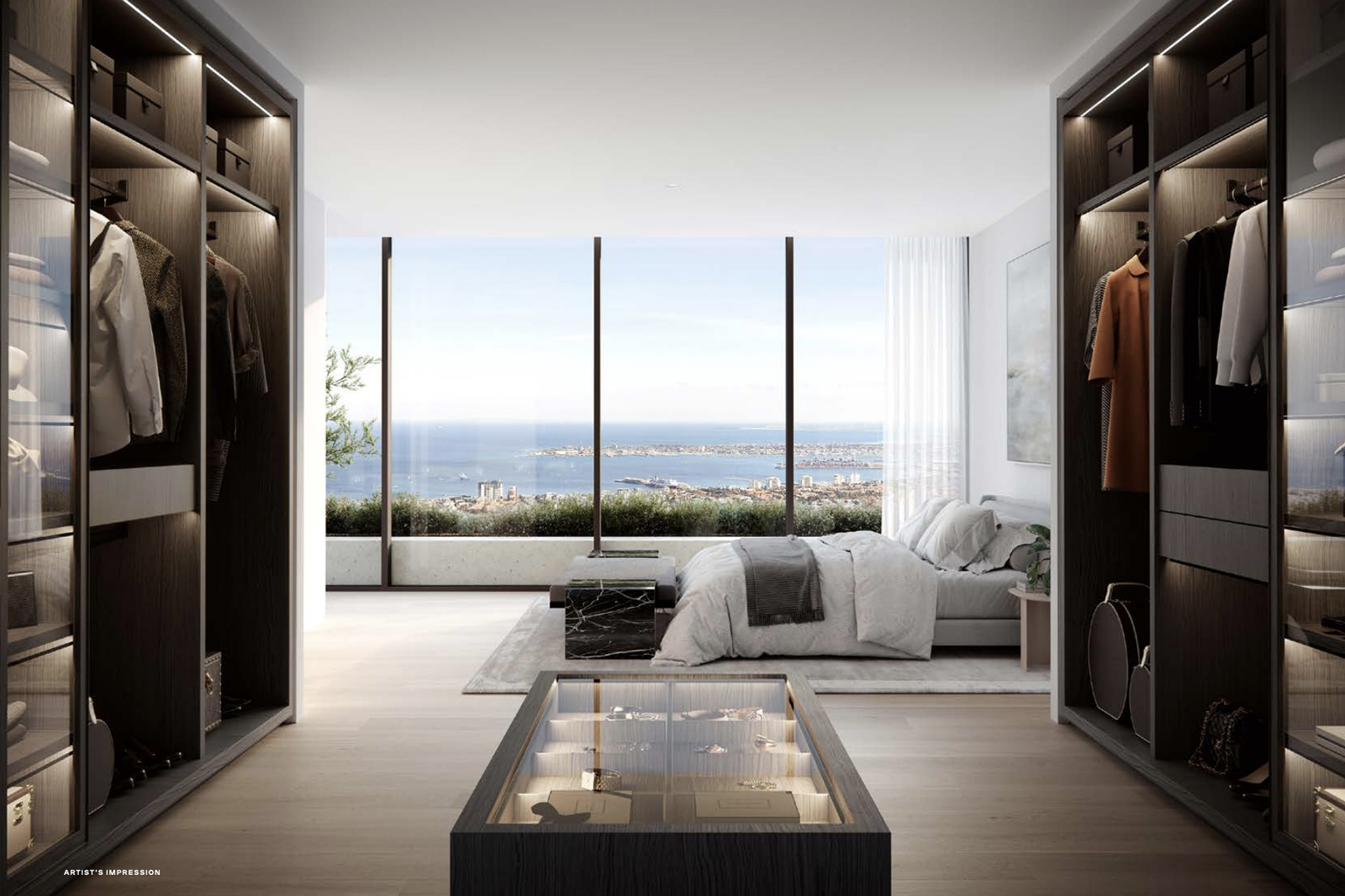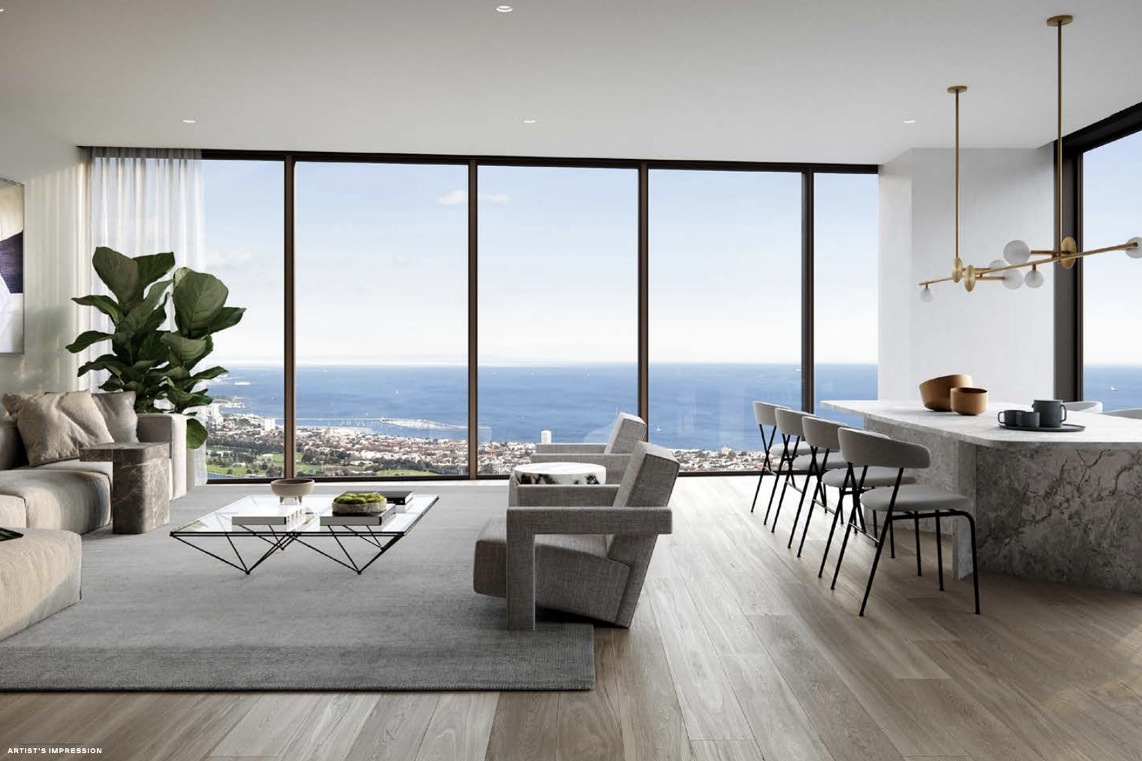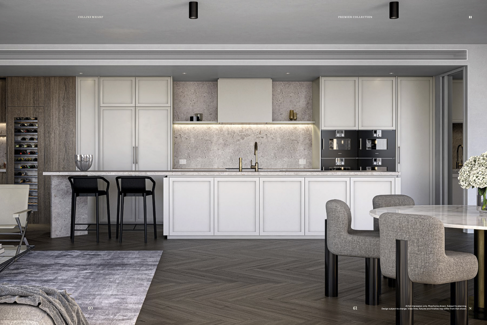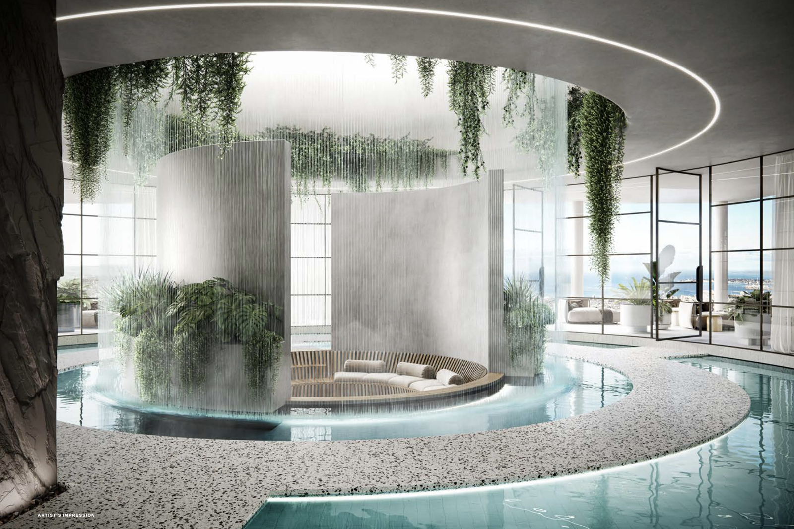 Entertainment areas are directed towards breathtaking taking views; bedrooms provide a retreat with walk-in robes and ensuites; dedicated study rooms draw on natural light and air. In each space, the materials are timeless, calming and neutral, reflecting the greenery of the gardens outside the window and the warmth that every modern home should have. The interiors of the residences are inspired by the building’s gardens and the views of surrounding Melbourne. The building’s iconic greenery acts as a natural control of daylight, shielding the apartments from direct sun during summer while maximising the natural light in winter. From the intuitive design of the kitchen spaces to the resilient surfaces of natural stone, large format porcelain tiles and metal accents, these living spaces have been designed for practical daily use and timeless appeal. Bathrooms and other rooms look out over lush greenery framing the spectacular city views, while earthy tones and natural materials create an environment of restrained organic beauty.